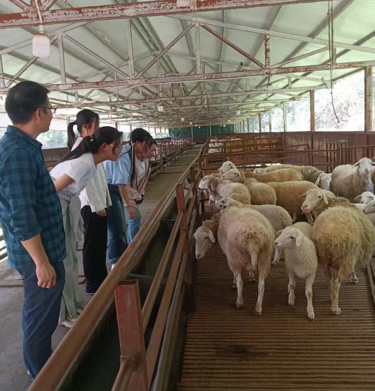 在湖南兴羴农业有限公司,张光友带领学生参观养殖基地,并向同学们介绍绵羊和山羊的养殖特点,以及外国羊品种与当地特色羊品种在形态和生活习性之间的区别。