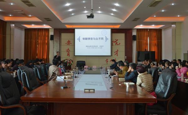 2月27日上午在多功能厅,我院邀请湖南省教科院职成所所长刘显泽给全体院领导和中层干部讲了一堂题为“创新使您与众不同”的讲座。