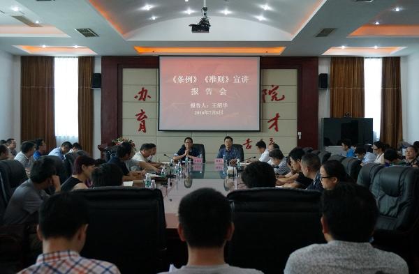 为贯彻中央和省、市关于加强党纪党规教育的重要部署,切实将《中国共产党廉洁自律准则》和《中国共产党纪律处分条例》的学习教育引向深入,7月8日下午三点我院在多功能厅举行了《站在实现中华民族伟大复兴的高度学习理解贯彻<准则>和<条例>》宣讲会,特邀请怀化市社科联党组书记、主席、怀化市《准则》《条例》市委宣讲团成员王绍华担任主讲,学院全体院领导、全体党员及正科级以上干部、中共党员发展对象参加了本次宣讲会,宣讲会由院党委书记胡佳武主持。