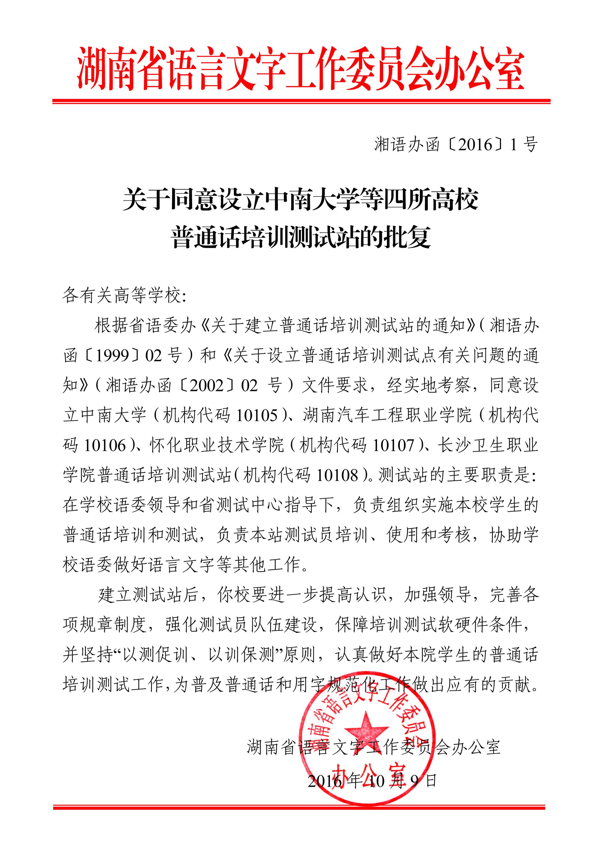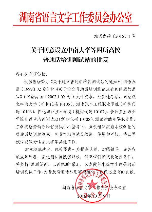 109,湖南省语言文字工作委员会办公室下发了“关于同意设立中南大学等四所高校普通话培训测试站的批复(湘语办函【20161号)”的文件,我院名列其中,标志着我院普通话培训测试独立建站终于变成现实,填补了学院的空白。